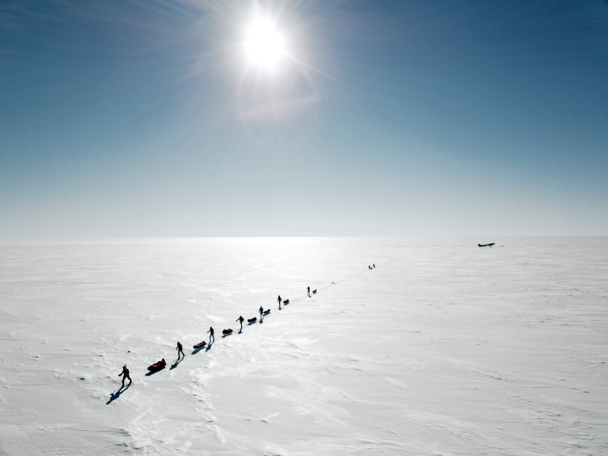Ski Last Degree team departs from 89° South on a sunny day.