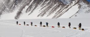 Climbers leave Vinson Base roped together in glacier travel mode, pulling sleds