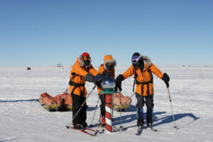 Ski South Pole team members place their hands on the Ceremonial South Pole.